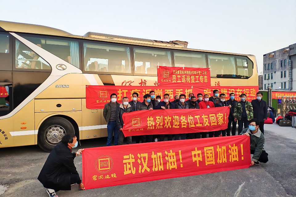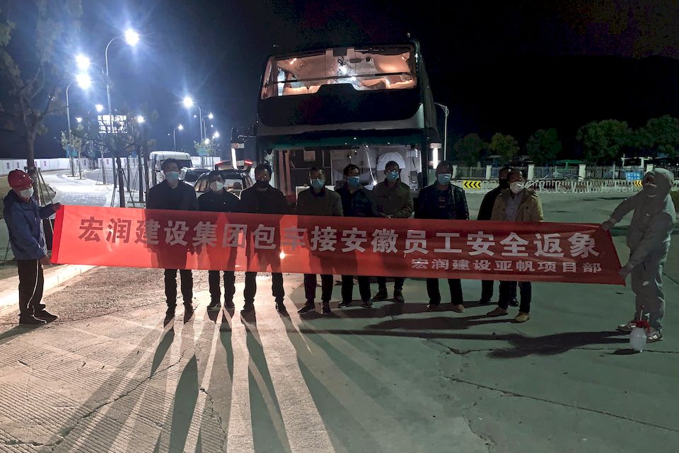 2020年2月21日晚11点,一辆搭载着“返象”务工人员的专车,从安徽省淮北市安全抵达象山县。车上每一位人员均通过审核后进入工地,这是象山亚帆中心工程“防疫复工两手抓”的一个剪影。