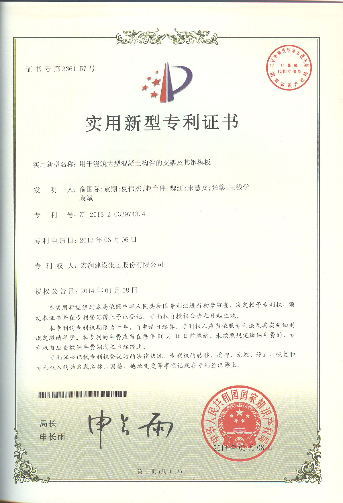 实用新型专利证书-用于浇筑大型混凝土构件的支架及其钢模板