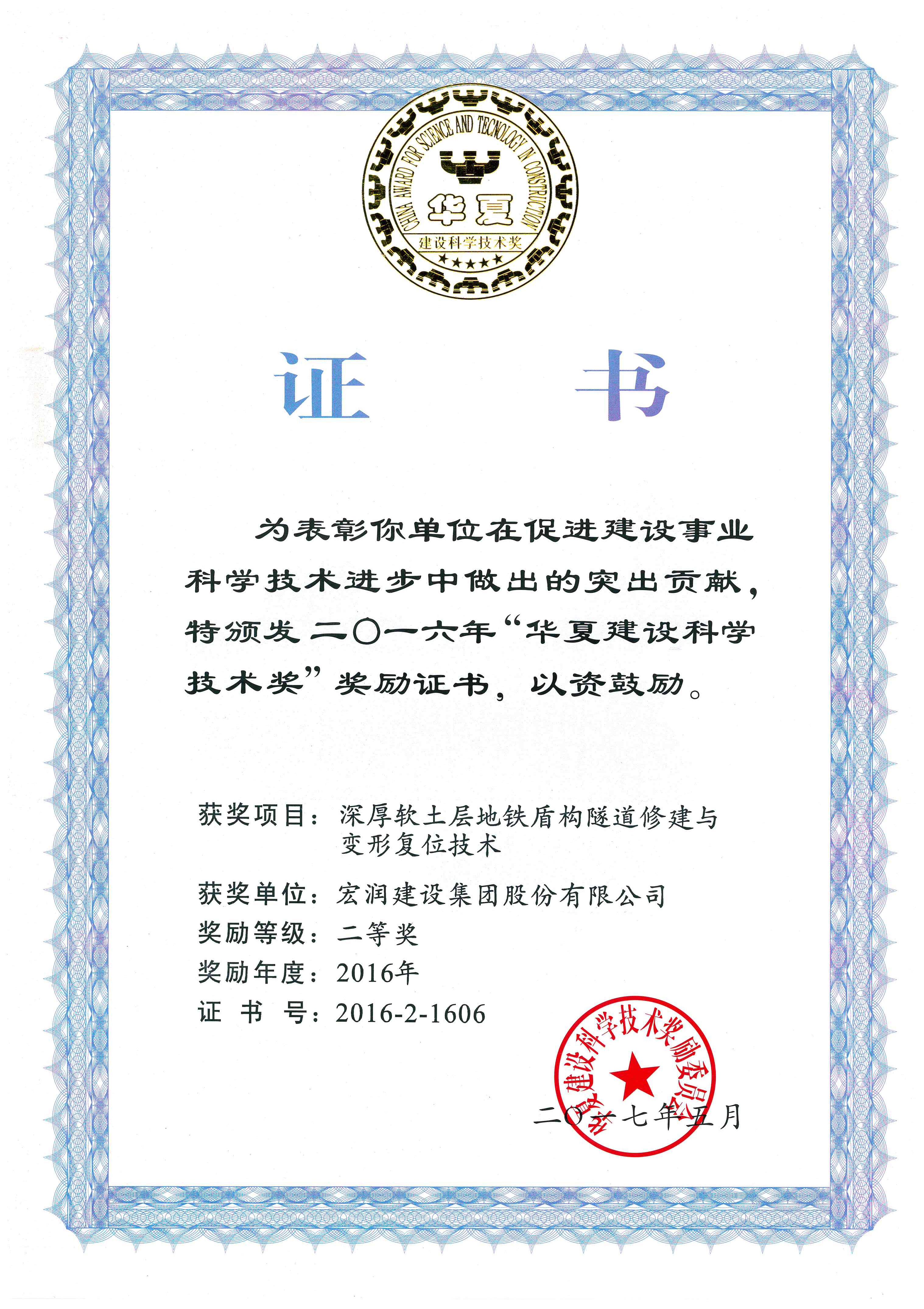 华夏建设科学技术奖二等奖证书-深厚软土层地铁盾构隧道修建与变形复位技术